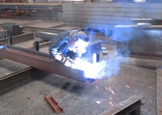 作成された図面に基づいて、H形鋼、鋼板と呼ばれる材料を切断、あなあけし、溶接で柱や梁などの部材を組立て製作する仕事です。