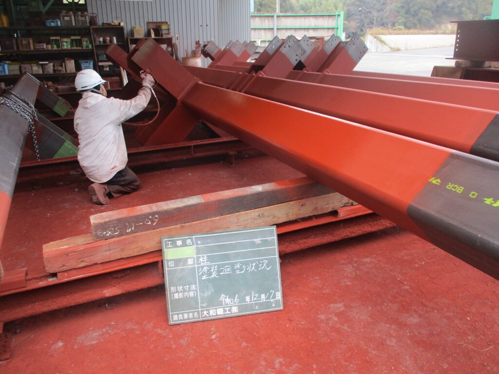 工場内で作られた製品をトラックに乗せ現場に搬入。組立は鉄骨鳶さん(鉄骨組立のスペシャリスト)が作業します。大和鐵工からも1名現場に行き、間違いがないか等を図面を見ながら確認します。